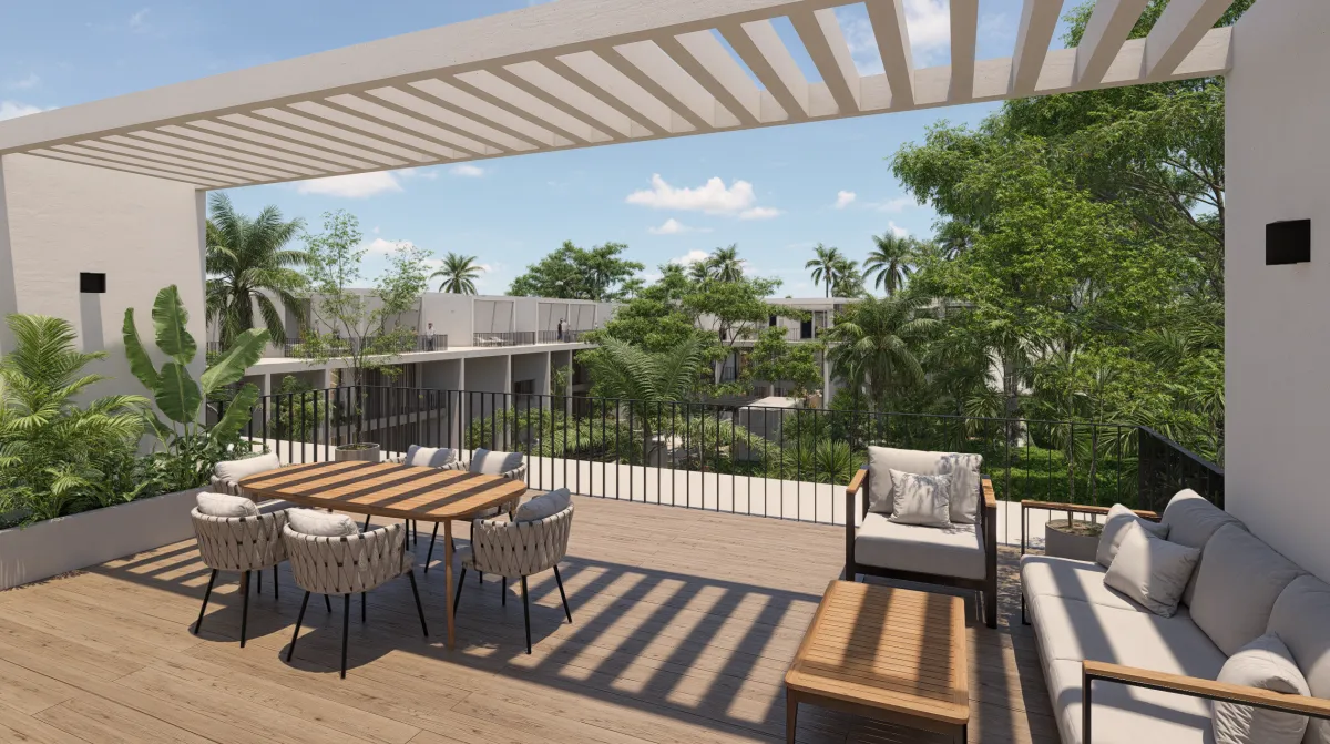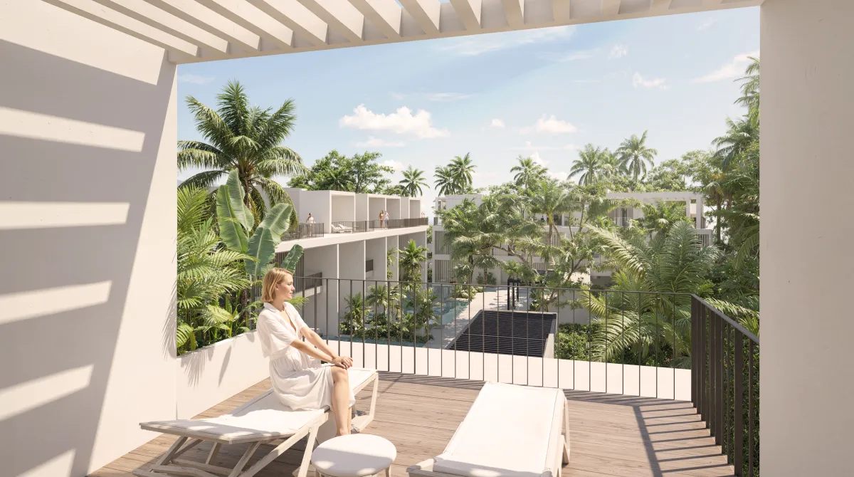 Villas privadas con acabados elegantes, amplios espacios interiores y exteriores, terrazas privadas, vistas tropicales expansivas y tecnología de hogar inteligente integrada.